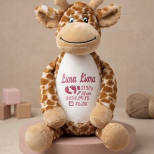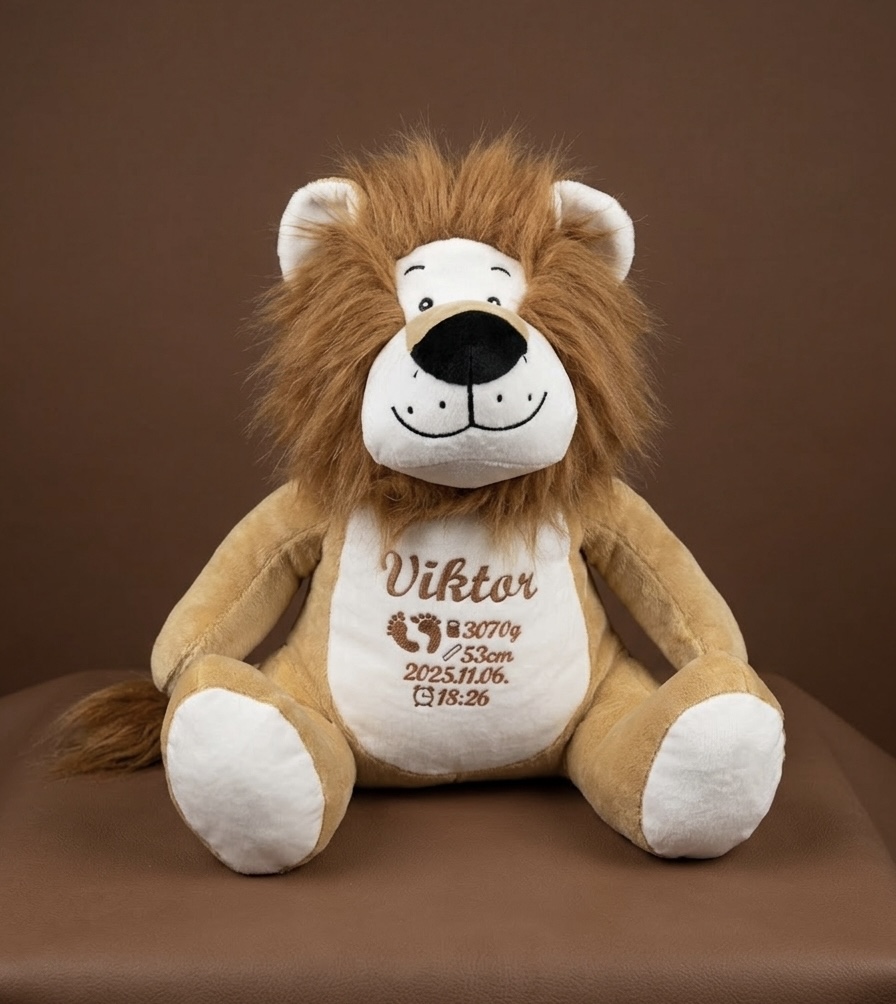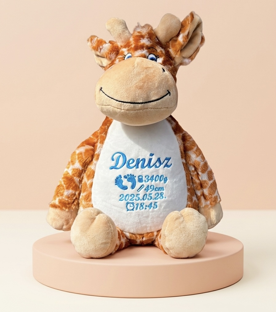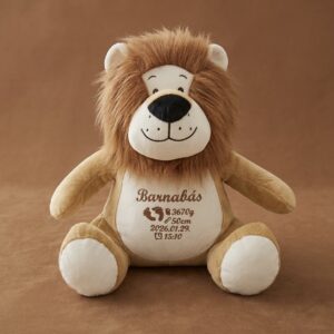 A hímzett róka plüssfigura nem csupán egy szokványos játék, hanem emlékezetessé teszi a pillanatot, hiszen a megrendelő kérésére belehímezzük a gyermek születési adatait.